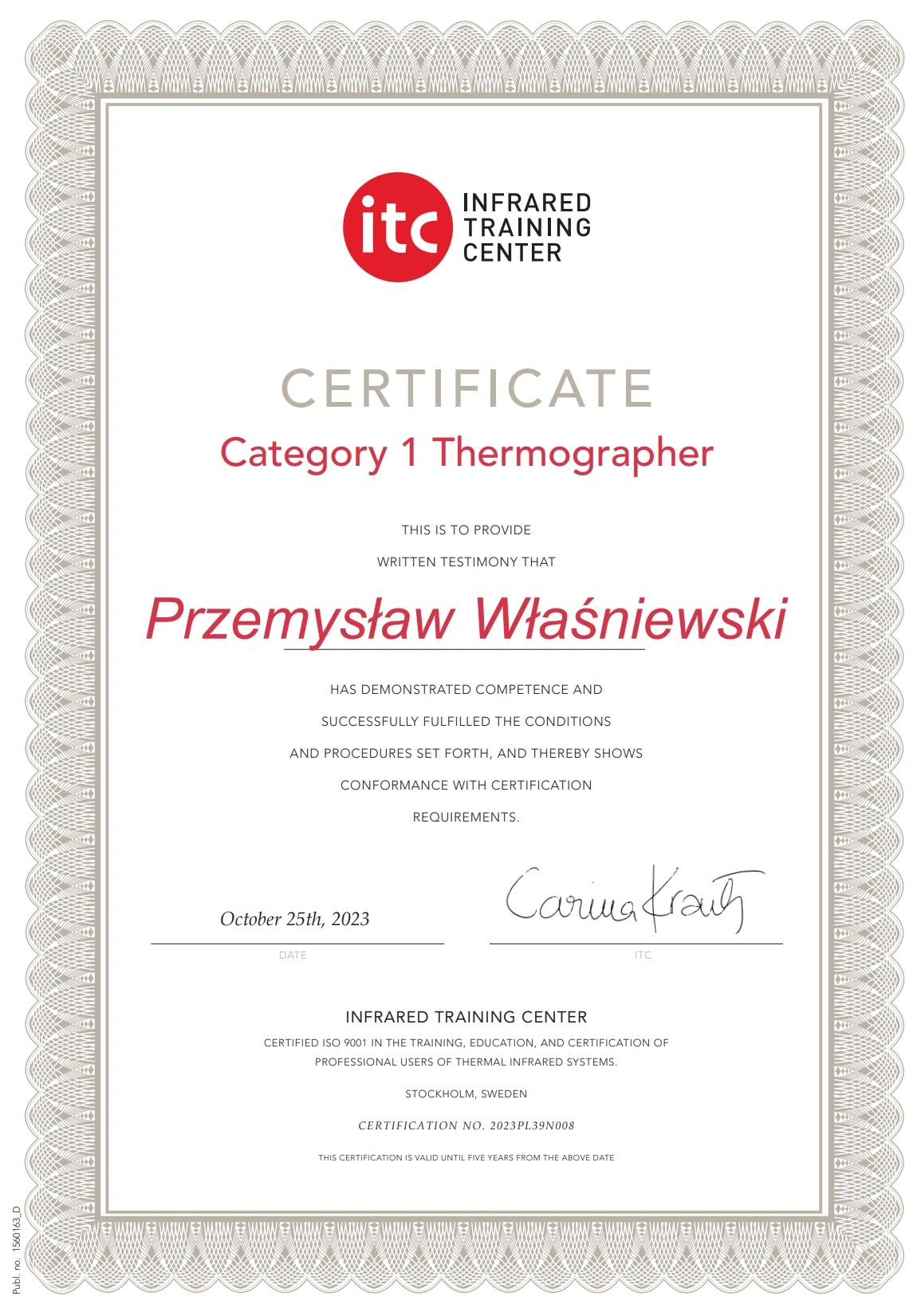 Jestem certyfikowanym operatorem termowizji, posiadającym międzynarodowe uprawnienia ITC Thermography Training Level 1. Moje kwalifikacje są zgodne z rygorystyczną normą ISO 18436, co gwarantuje najwyższy standard oraz precyzję przeprowadzanych badań. Dzięki szkoleniu w prestiżowym ośrodku Infrared Training Center, skutecznie realizuję inspekcje w obszarze budownictwa, energetyki oraz diagnostyki maszyn. W codziennej pracy wykorzystuję zaawansowaną wiedzę z zakresu akwizycji danych, co pozwala mi bezbłędnie odróżniać rzeczywiste defekty od refleksów czy błędów pomiarowych. Każde badanie kończę przygotowaniem profesjonalnego sprawozdania technicznego, które stanowi rzetelną podstawę do dalszych działań naprawczych. Wybierając moje usługi, zyskują Państwo pewność pomiarów wykonanych przez specjalistę z certyfikatem uznawanym na całym świecie.Raport z certyfikatem w 48h.